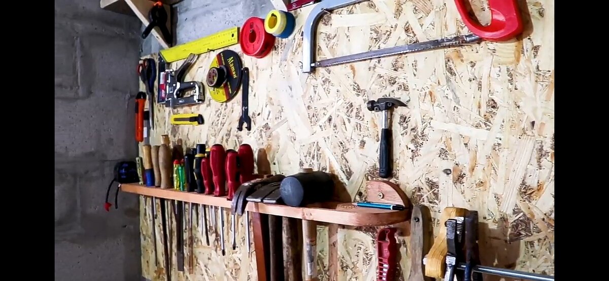 Для отверток можно сделать обычную полку, в которой нужно просверлить отверстия. Теперь берем отвертки и втыкаем в наши отверстия.