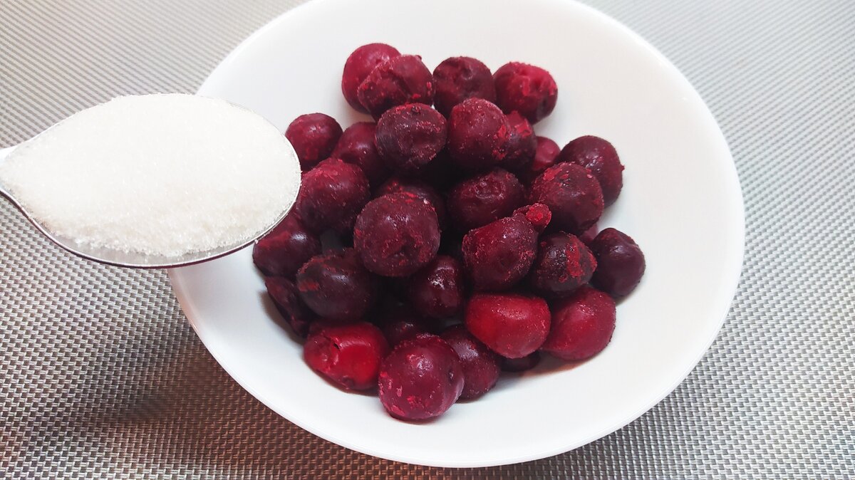 Вишня у меня замороженная без косточки. Ягоду засыпаю сахаром на свой вкус.