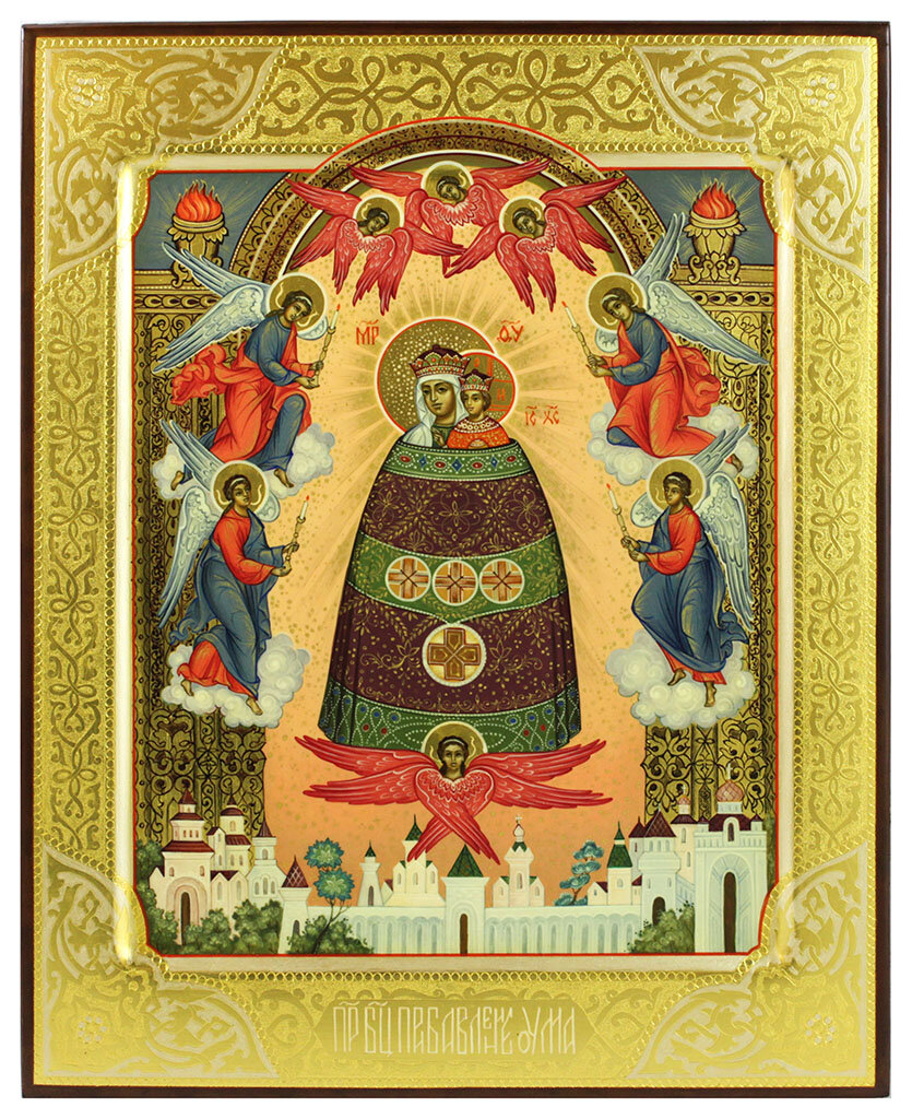 Вся́ земля́ Ру́сская преиспо́лнена, я́ко звезда́ми богосве́тлыми, чудотво́рными ико́нами Твои́ми, Богоро́дице Де́во, в не́йже и сия́ ико́на Твоя́, «Прибавле́ние ума́», благода́тию сия́ет и согрева́ет оледене́лая сердца́ на́ша зна́меньми ми́лости Твоея́ к на́м гре́шным. Сего́ ра́ди пред ли́ком Твои́м святы́м прекло́ньше коле́на, воспева́ем Тя́, Всепречи́стая Ма́ти на́ша, та́ко:
