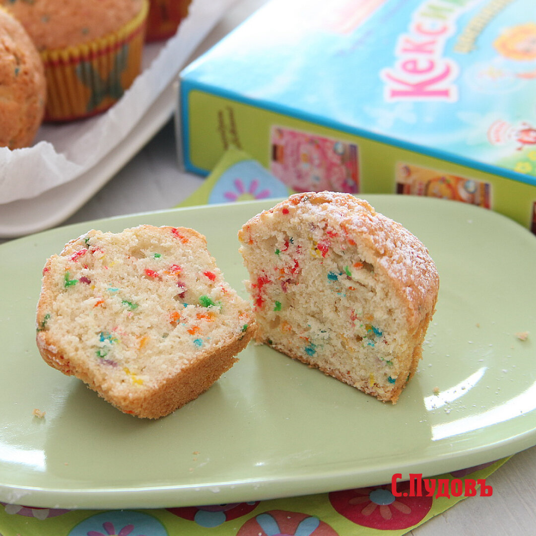 По-детски милые, яркие и вкусные! Пахнут ванилью, радуют глаз, украшают стол :) Эти простые домашние кексики с разноцветным «конфетти» внутри выпекаются в формочках в духовке.
