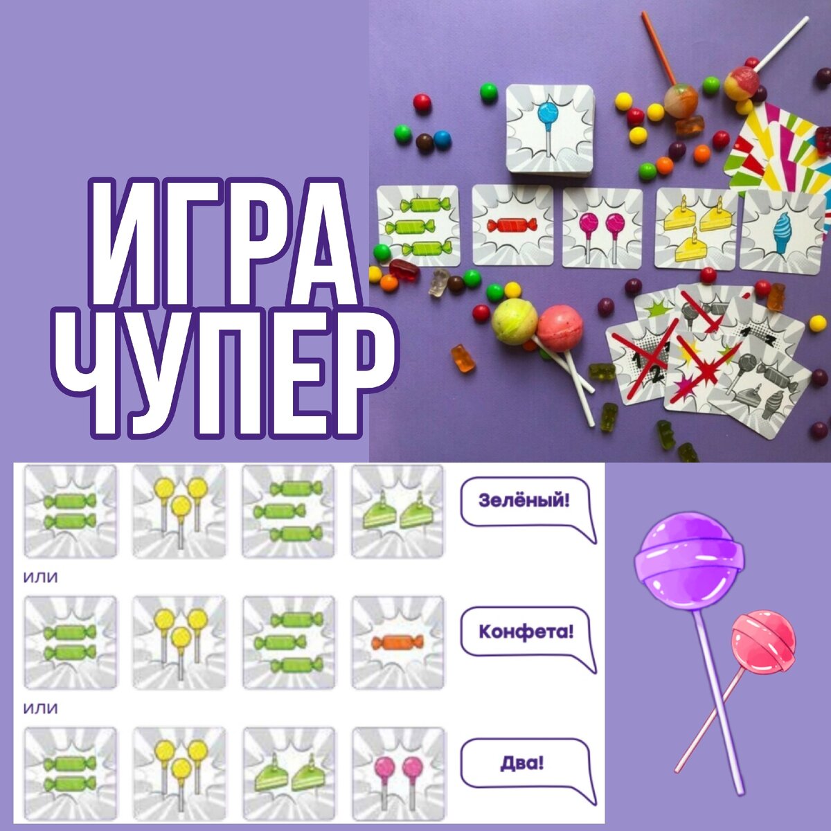 Карточки можно объединять по трём признакам: цвет, количество и вид конфеты. И ох как непросто, когда внезапно открываются новые вкусности, быстро сообразить, что нужно кричать: "ТРИ?!" "КОНФЕТА?!" или "ЗЕЛЁНЫЙ?!" Здесь победят только истинные сладкоежки 🍬🍬🍬