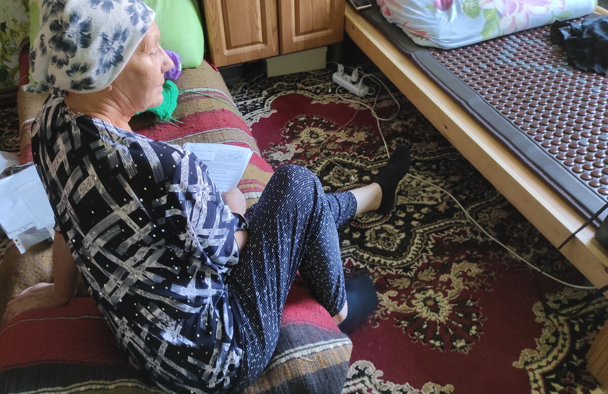 «Под старость лет я оказалась в таком положении, хоть плачь. Сначала не могла уехать, потому что границы были закрыты. А теперь лечение, - она перебирает выписки из онкодиспансера. - Четыре химии уже сделали. Откапаюсь на дневном стационаре, приезжаю домой – нормально. А на следующий день начинается… Головные боли, тошнит, рвет, суставы крутит, зубы крошатся, спать не могу, есть не могу. Неделю мучаюсь, потом потихоньку проходит. Выхожу на улицу, сижу во дворе на лавочке. Потом начинаю больше ходить, по микрорайону гуляю».