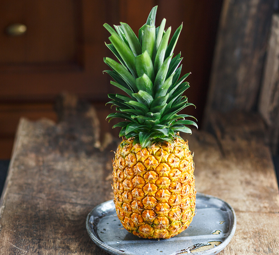 Поставьте ананас и срежьте с него кожуру.