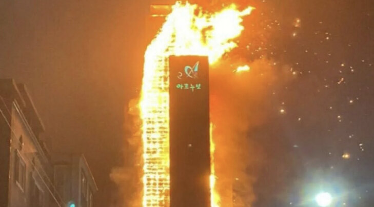 На юго-востоке Южной Кореи загорелся жилой небоскреб. Огонь охватил почти все здание. Пожарные не могут потушить его более девяти часов из-за ветра и углей, скрытых между внешними панелями