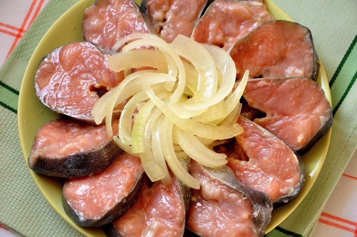 2. Укладываем куски рыбы в контейнер или любую глубокую емкость.
