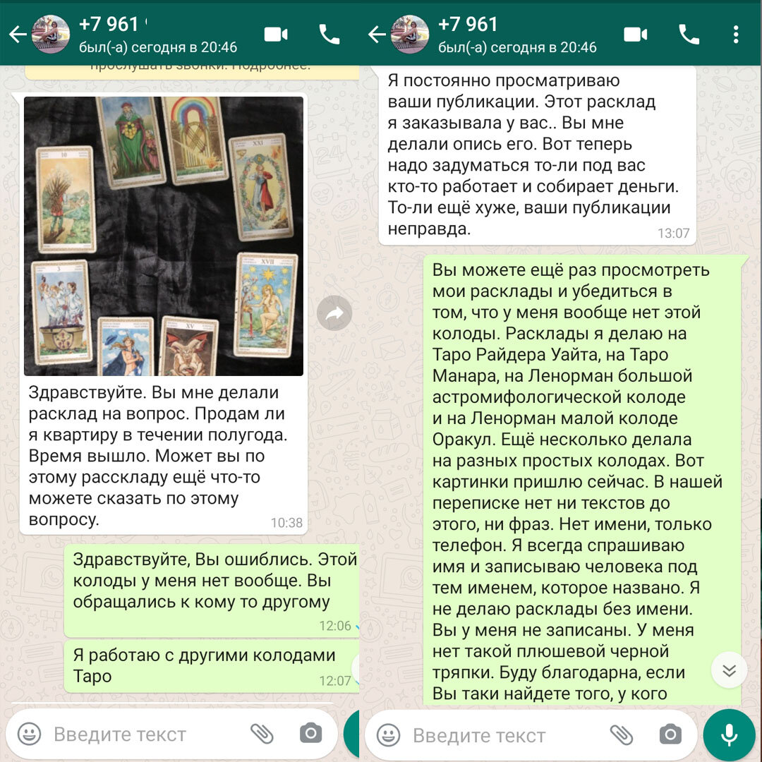Вчера я выяснила, что кто то работает под меня. В Вотсапе написала девушка, предъявив расклад и сообщив, что он не сбылся. Фото расклада прилагаю.