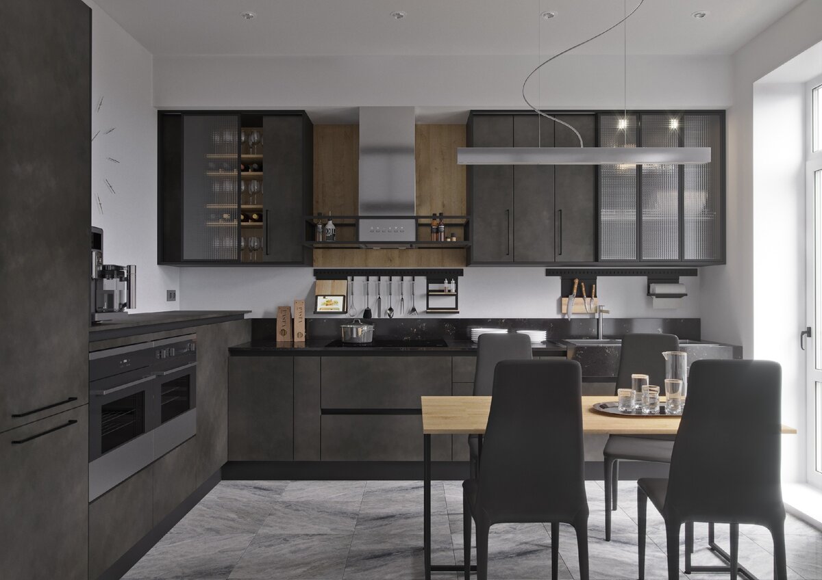 2. Чёрный, точнее – монохром, то есть сочетание чёрного и белого. Откровенно говоря – не самое практичное, но зато невероятно стильное решение. Но есть одно правило – фасады чёрной кухни не должны быть глянцевыми, ведь это уже много лет один из главных антитрендов кухонного дизайна.