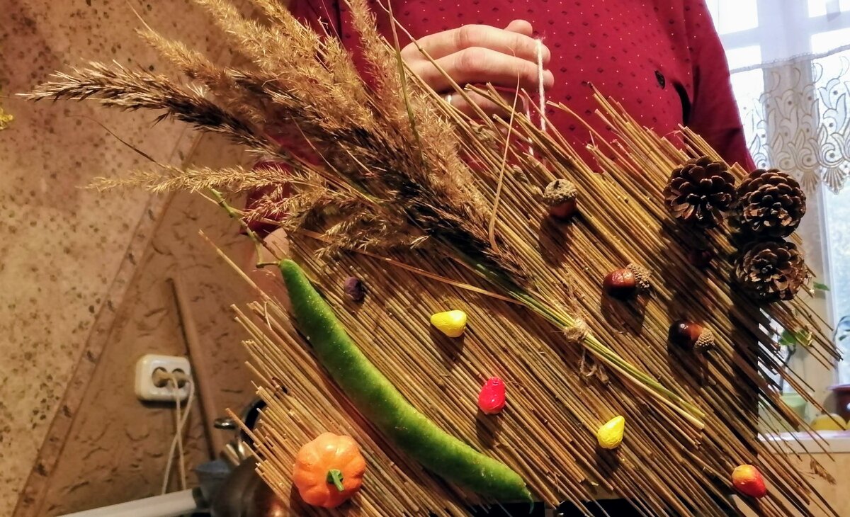 Решили сделать настенное панно из сухой соломки. Я старалась по максимуму отдать инициативу дочке, поэтому эта поделка практически целиком выполнена ручками трехлетки (я лишь помогала в приклеивании украшений).