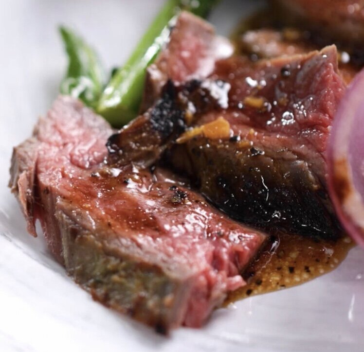 Перед нарезкой дайте стейку отдохнуть пару минут. Положите стейк на кольца красного лука и жареную брокколини. Закончить с морской солью и сбрызнуть соусом из черного перца. Наслаждайтесь!