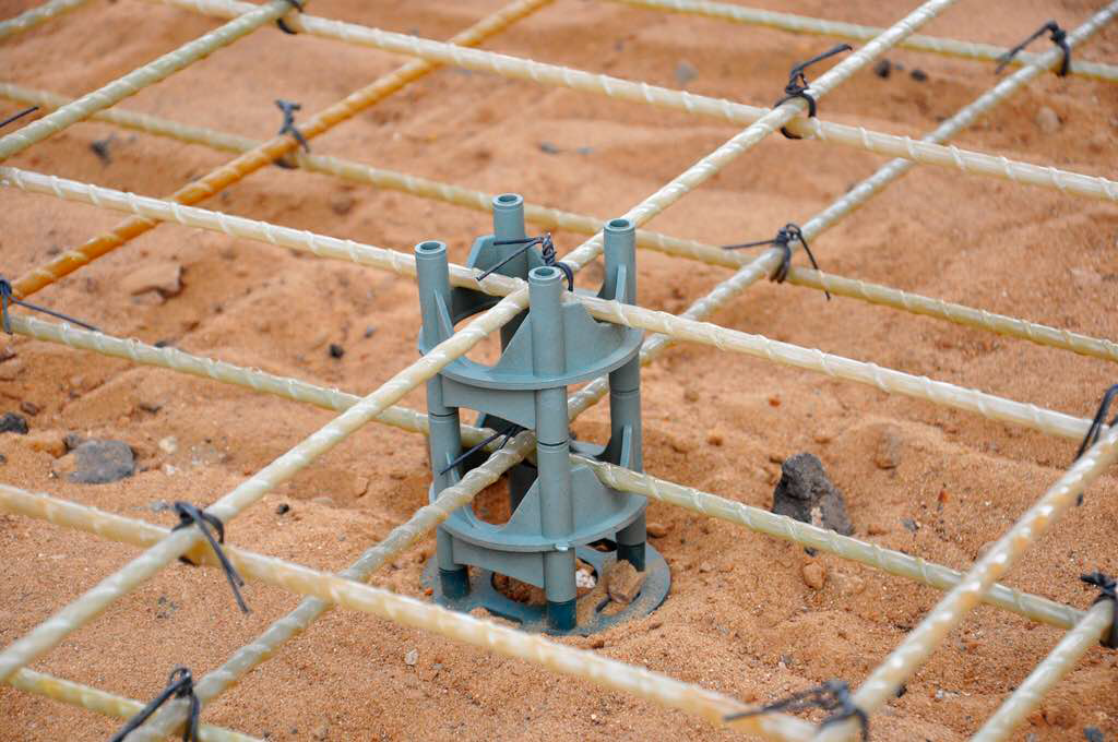 На фиксаторы устанавливаем армированную сетку. Сетка должна быть ровно посередине траншеи фундамента, это позволит сделать фундамент максимально прочным и долговечным.