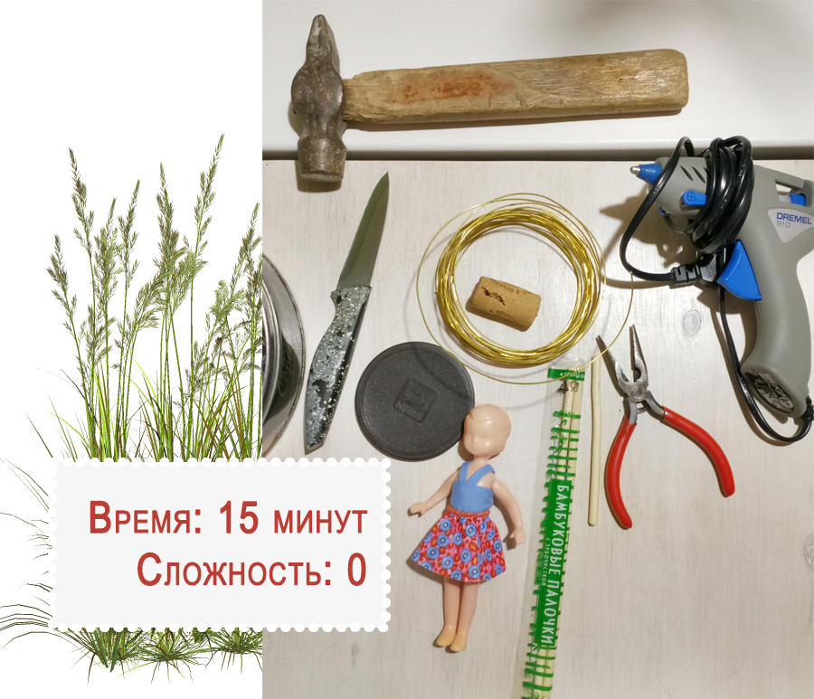 Итак, нам понадобятся: маленькие круглогубцы, молоток, палочки от суши, пробка от вина, любая крышка от банки подходящего диаметра, проволока (можно заменить на выпрямленную скрепку), нож, клеевой пистолет и сама кукла для замеров.
