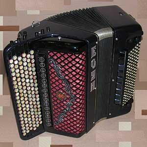 - Корпус баяна покрыт итальянским чёрным целлулоидом, мех – итальянский классический.