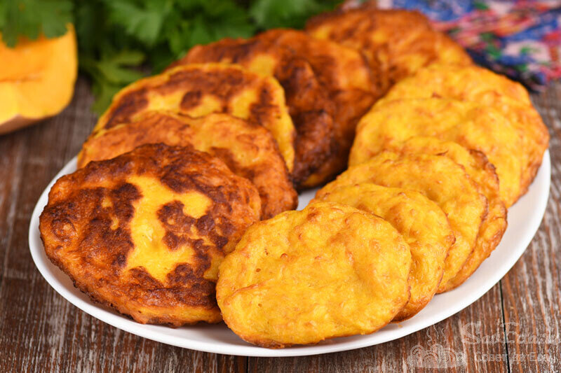 11. Готовые оладьи из тыквы перекладываем на тарелку и сразу подаем на стол. Все они очень нежные, ароматные и вкусные. Но у оладий из духовки получается более выраженный вкус тыквы. У оладий на сковороде вкус тыквы почти не чувствуется, и они более пышные.