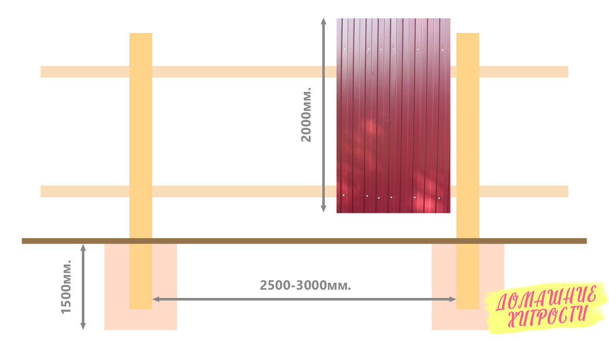 · Можно расположить как впритык под секциями профнастила, так и на некотором расстоянии от забора.