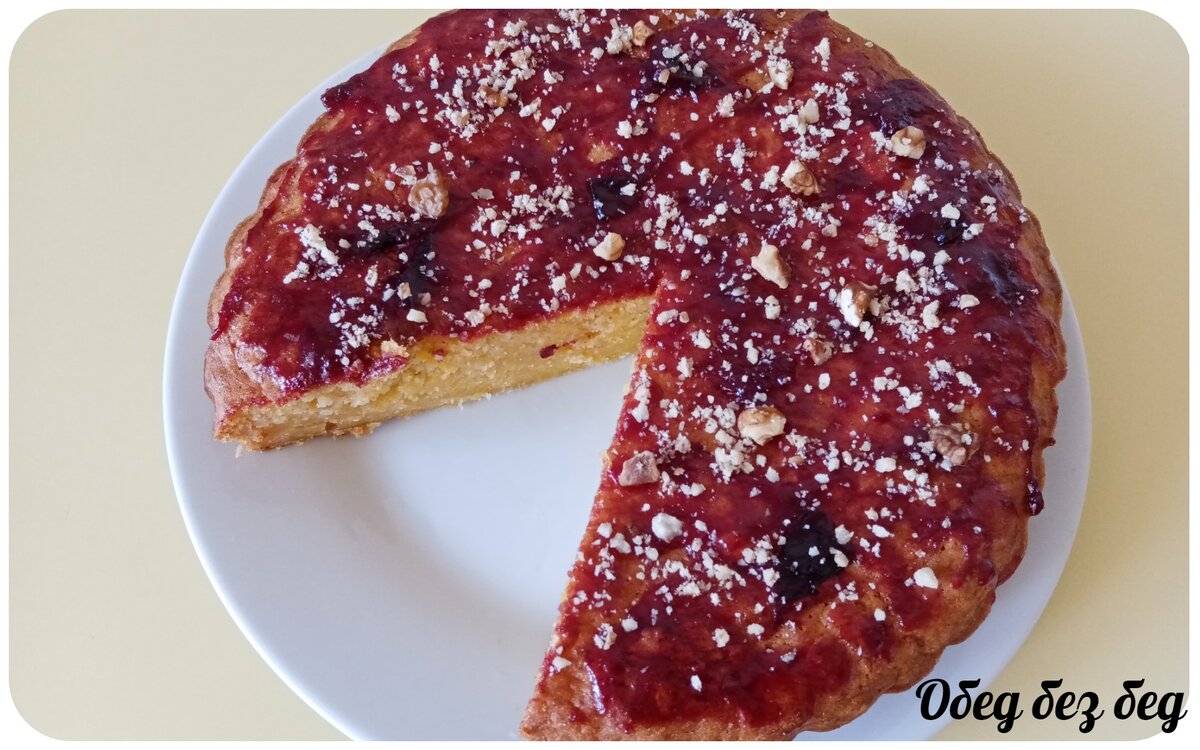 Сверху смазываем любым вареньем. У меня было сливовое в этот раз. Я еще посыпала грецкими орехами.