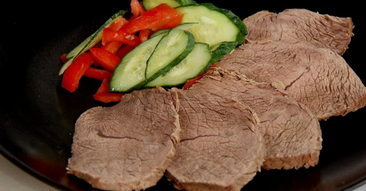 Крупные куски отварной говядины, свинины, курицы, с репчатым луком,