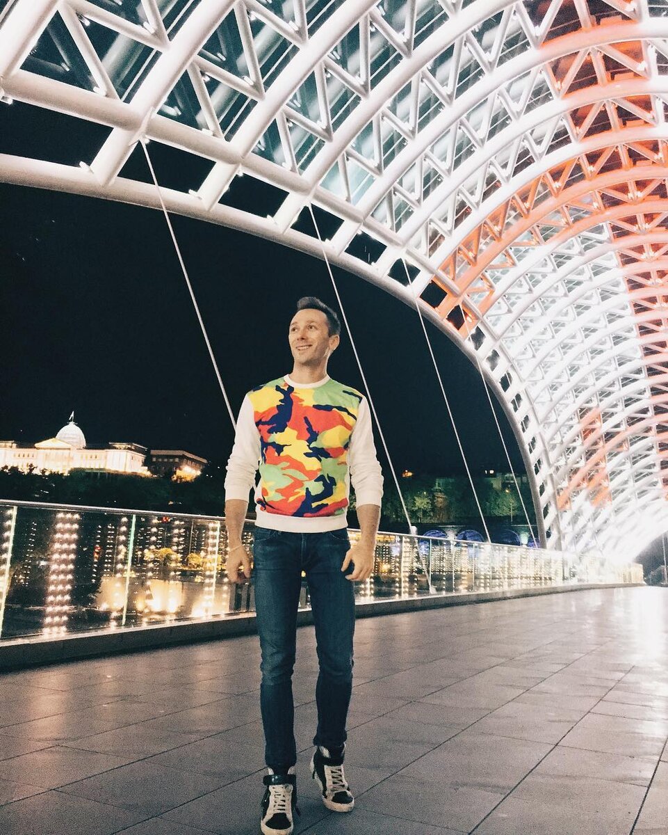 Всё, что светится на этой фотографии (за исключением меня), создано благодаря Михаилу Саакашвили. С его легкой руки в Тбилиси, да и затем во всей остальной Грузии начался смелый эксперимент по архитектурному обновлению "лица" страны с участием мировых звёзд. Например, эти стеклянно-стальной Мост мира и расположенный на горе Президентский дворец были построены известным итальянским архитектором Микеле де Лукки.