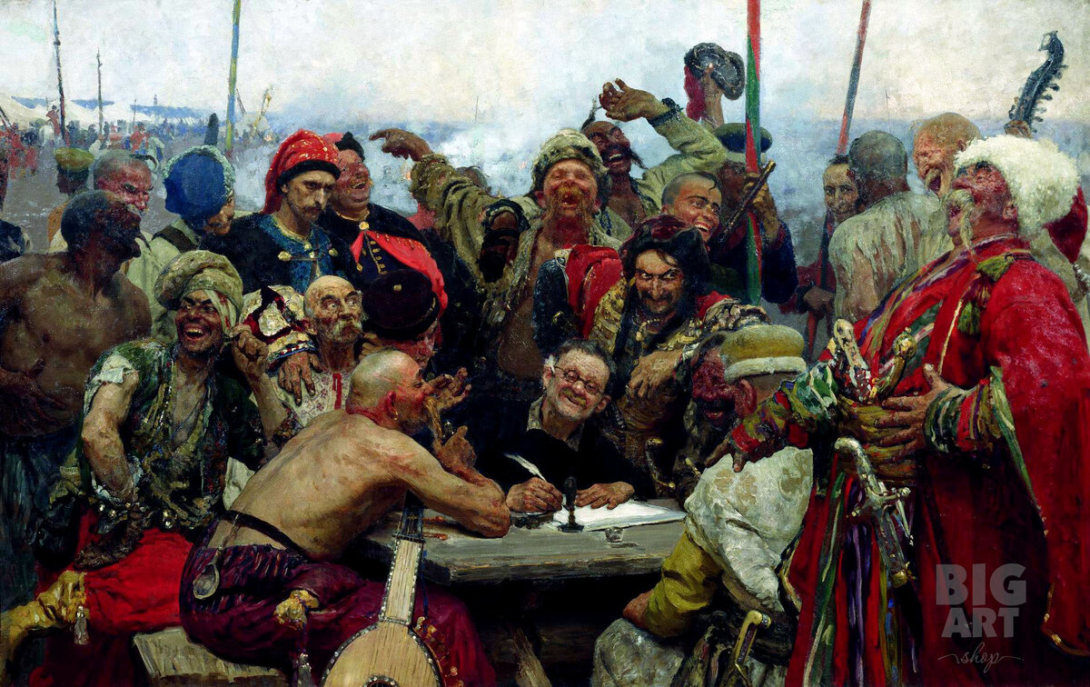 Сколько себя помню, столько помню и эту картину. У бабушки под стеклом в богатой золоченой раме висела большая репродукция «Запорожцев…», которую я могла разглядывать часами. В детсадовском возрасте меня восхищали сережки в ушах похожих на пиратов взрослых мужчин жутковатого вида. Еще удивляли странные прически: лысые головы с тонким чубом. Бабушка объяснила мне, что такая «зачіска» обязательна у запорожских казаков и называется «оселедец».