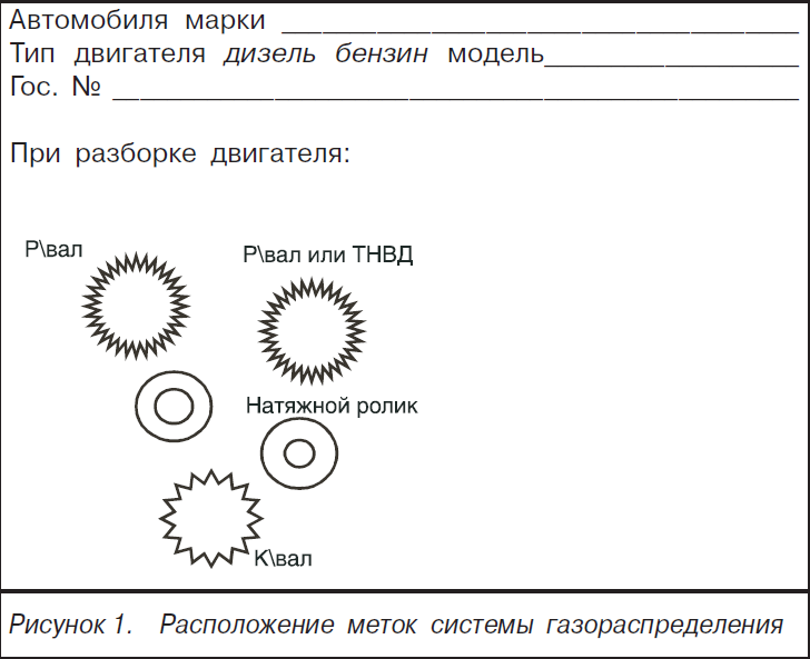 Перед разборкой двигателя нужно внимательно изучить материалы по установке деталей газораспределительного механизма, взаимное расположение, соответствие установочных меток всех участвующих валов. Желательно составить рисунок с взаимным расположением меток на двигателе или воспользоваться заранее заготовленным эскизом (Рис.1). Разборка снятого двигателя выполняется в отдельно установленном месте, чтобы исключить смешивание крепежа и мелких деталей с другими разобранными узлами и агрегатами.