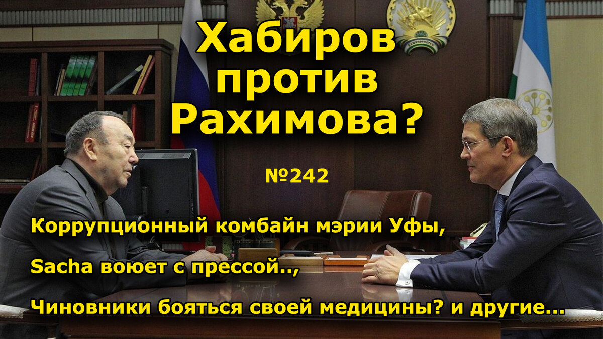 Хронометраж выпуска: 00:35 - Зачем Хабиров наезжает на Рахимова?; 09:42 - Коррупционный комбайн мэрии Уфы; 15:44 - Sacha воюет с прессой...; 19:01 - Чиновники бояться своей медицины?; 22:57 - Что творится в "Биосфере"?; 25:08 - Ставьте лайки!; 26:01 0 Нагаево: ничего святого?