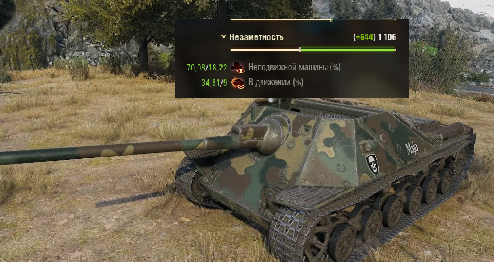 Это характеристики при 100% экипаже без модулей. Если поставить перки на маскировку, маскировочную сеть, то незаметность вырастет до 62,76/22,03 на месте и 33,59/11,79 в движении.