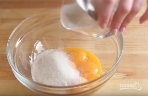 1. Для приготовления бисквита разделите 6 яиц на белки и желтки. Желтки взбейте с половиной сахара до пышной светлой пены.