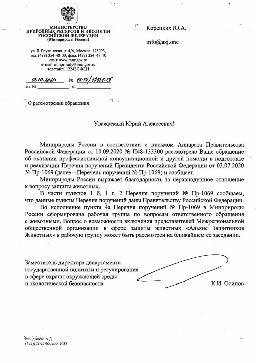 После этого мы направили Михаилу Мишустину письмо, в котором выразили готовность оказывать консультационную и любую другую необходимую помощь в рамках работы Правительства над поручениями президента. И вот недавно мы получили ответ из Министерства природы, в котором указывается, что вопрос о возможности включения в рабочую группу представителей "Альянса Защитников Животных" может быть рассмотрен на ближайшем ее заседании.