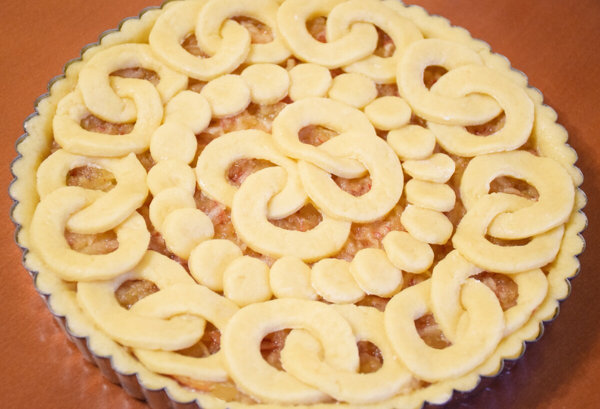 10. Вы можете украсить пирог по своему желанию, я буду раскладывать колечки как бы внахлёст.