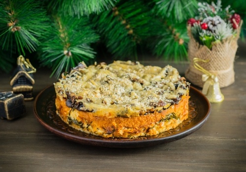 Чтобы проверить готовность, нужно вставить зубочистку в центр пирога, она должна выходить сухой. Цвет готового пирога будет золотистый. Достать его из духовки и немного остудить в форме. Пройтись ножом вдоль бортиков и снять их. Пирог можно приготовить за день до праздника, обернуть фольгой и убрать в холодильник. Подавать его можно и теплым, и как холодную закуску.