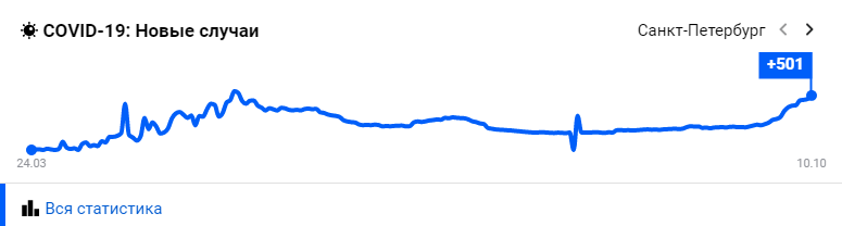 За минувшие сутки, 9 октября, в России зафиксировали 12 846 новых случаев заражения коронавирусом. Из них 501 пришелся на Петербург, а 96 — на Ленобласть. Об этом сообщили в информационном центре по мониторингу ситуации с COVID-19.