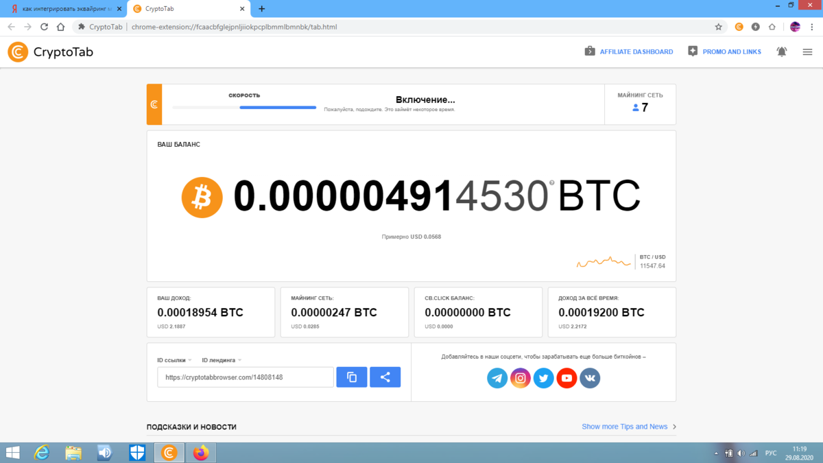 В данной статье хочу поделиться и сделать обзор самого лучшего и достойного браузера с функцией майнинга! CryptoTab Это самый обычный РУССКОЯЗЫЧНЫЙ браузер вроде Firefox или Explorer, к которым все давно привыкли, где тоже можно установить домашнюю страницу Яндекс или Mail - кто к чему привык. При нажатии маленькой иконки CryptoTab в верхнем правом углу браузера появляется такая вот страничка, как Вы видете на фото 1. Здесь мы можем видеть, сколько уже получено сатош, можно выставить скорость майнинга (если чувствуете, что компьютер притормаживает - можно уменьшить скорость майнинга), а также даны ссылки на дополнительные функции майнинга, такие как привлечение рефералов, промоакции, социальные сети и т.д. Тут же есть реферальная ссылка для привлечения рефералов - просто копируешь ее и отправляешь друзьям, знакомым и т.д. В общем все довольно просто и беззаботно. Следующая "кнопка" вверху AFFILIATE DASHBOARD - попадаем вот на такую страницу: Здесь мы можем вывести свои биткои