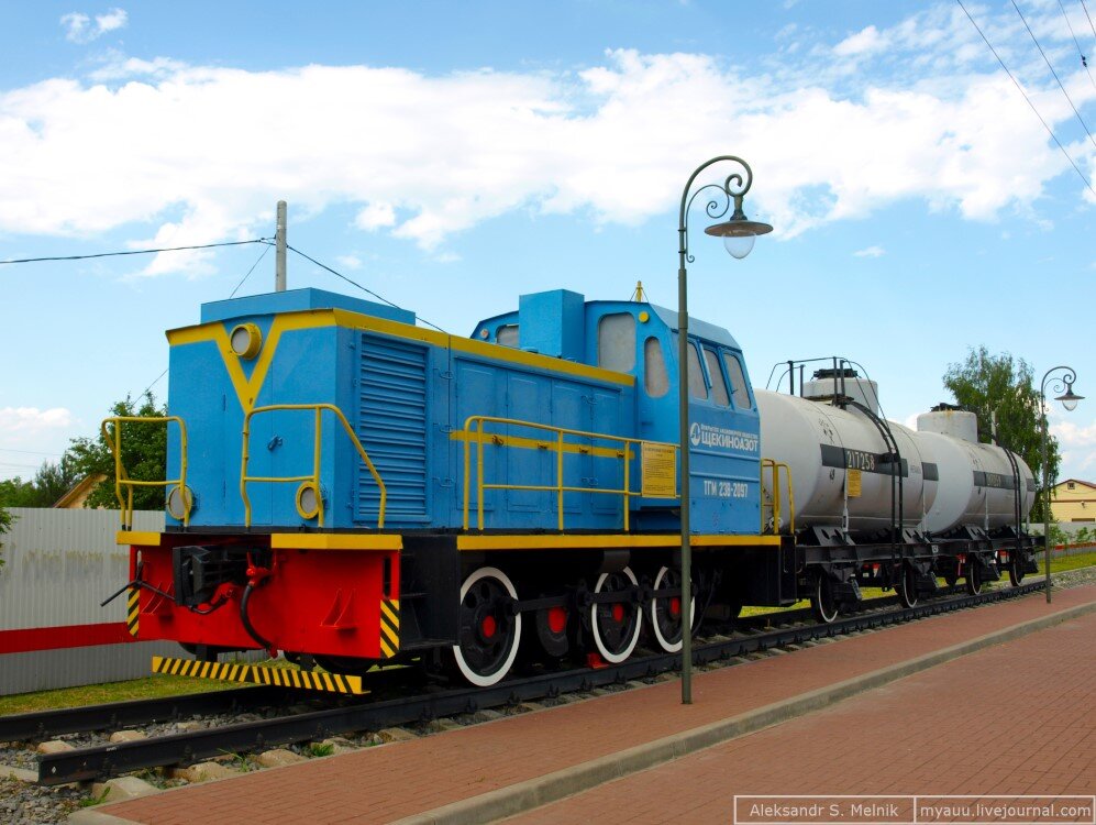 Небольшой маневровый тепловоз типа ТГМ23 с двумя железнодорожными цистернами стоит у платформы станции Щёкино.