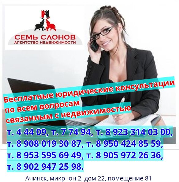 Бесплатные юридические консультации по всем вопросам связанным с недвижимостью. Наша компания более 13 лет на рынке недвижимости. Предлагаем вам большой выбор недвижимости. Покупка Продажа Аренда. Весь спектр сделок с недвижимостью.Работаем с любым видом сертификата. Подача ипотеки во все банки, в одном месте. Помощь в получении ипотеки. Бесплатная юридическая консультация. Крупнейший офис в г. Ачинске. Особый подход к каждому клиенту, надёжность и прозрачность сделок. Агентство недвижимости "Семь Слонов. Ачинск, микр -он 2, дом 22, помещение 81. т. 4 44 09, т. 7 74 94, т. 8 923 314 03 00, т. 8 908 019 30 87, т. 8 950 424 85 59, т. 8 953 595 69 49, т. 8 905 972 26 36, т. 8 902 947 25 98. 4-44-09@mail.ru