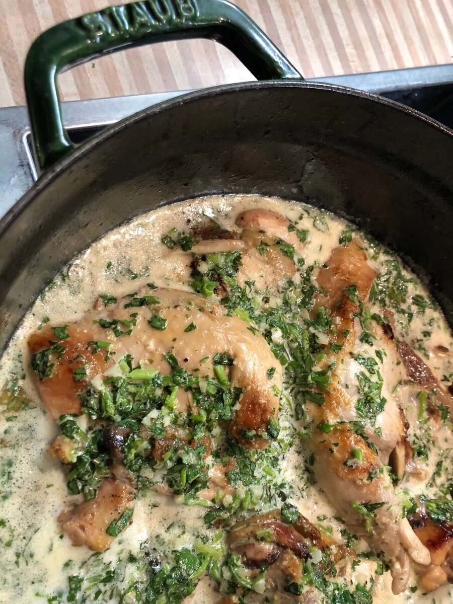 ✅ Залить курицу на чугунной сковороде смесью, и в 180* духовку минут на 30-40. В идеале все конечно делать на кеци (глиняной грузинской сковороде), но у меня индукция, и она глину «не видит».