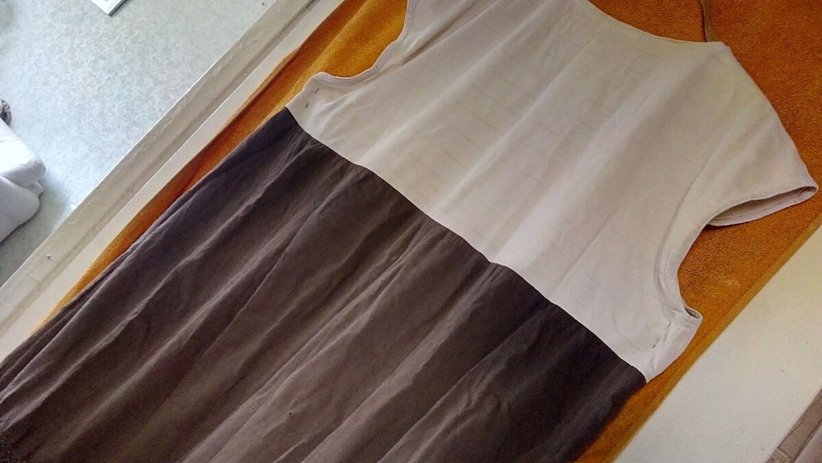 С первым было всё просто: имелась х/б блуза без застежки и длинная батистовая юбка на резинке, в которой я постоянно путалась при ходьбе. В итоге я подрезала блузу на уровне высшей точки груди, отрезала резинку у юбки и, присборив, пришила её к полочке. Получилось лёгкое, широкое платье, в котором удобно и по дому управляться, и в огороде на грядках работать, потому что НЕ ЖАРКО!