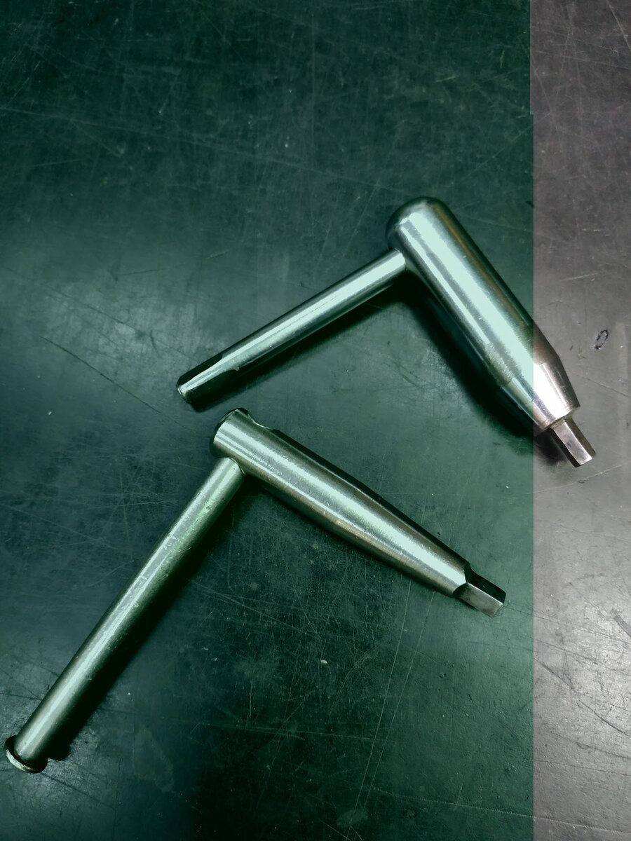 Для начала я нашел шестигранник и прямоугольник, они должны быть слегка подкаленные, чтобы при заворачивании болтов не происходило замятия ключа. После этого я выточил на токарном станке два прутка для державок, в торце которых я