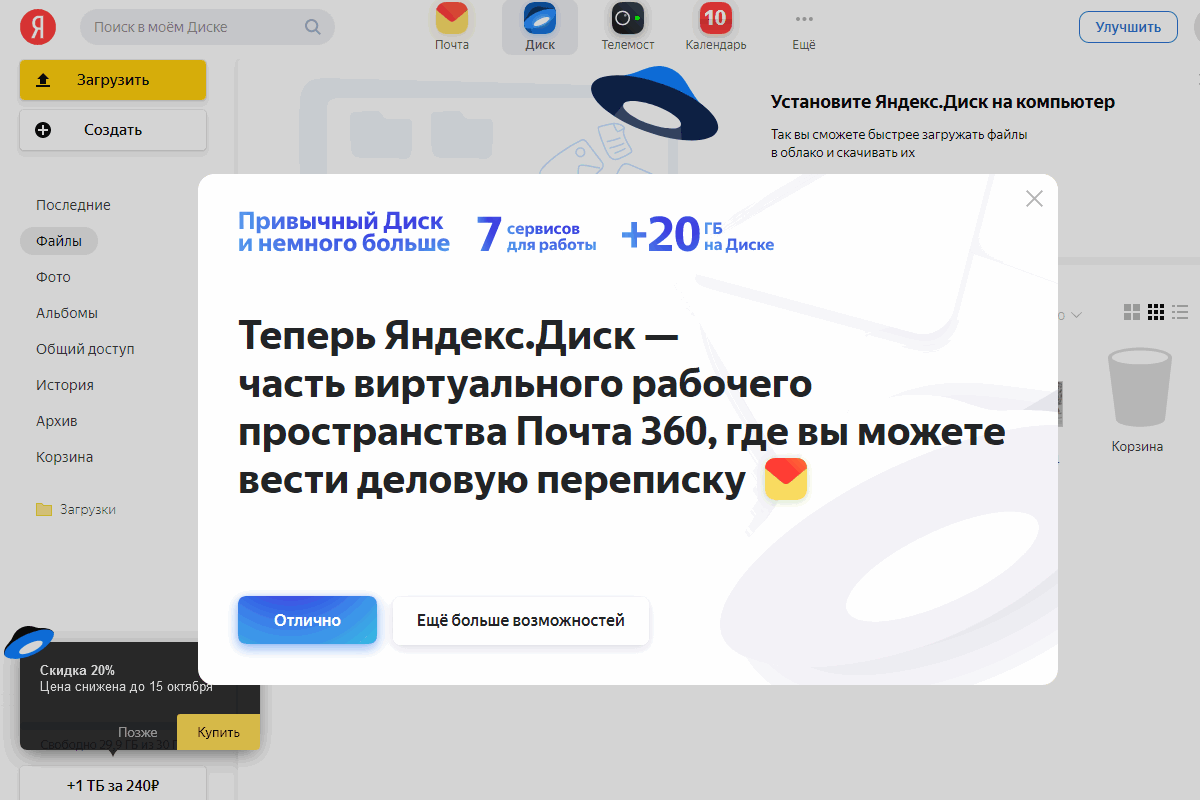 Сейчас всем пользователям дают по умолчанию 10 ГБ пространства на Яндекс.Диске. Дополнительные 20 ГБ дают за переход на "Почту 360". По большому счёту она отличается от обычной почты только появлением в ней новых сервисов и их иконок.