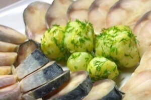 Нарезается рыба тонкими пластиками. С горячей картошечкой пропитанная чесноком малосольная скумбрия тает во рту.