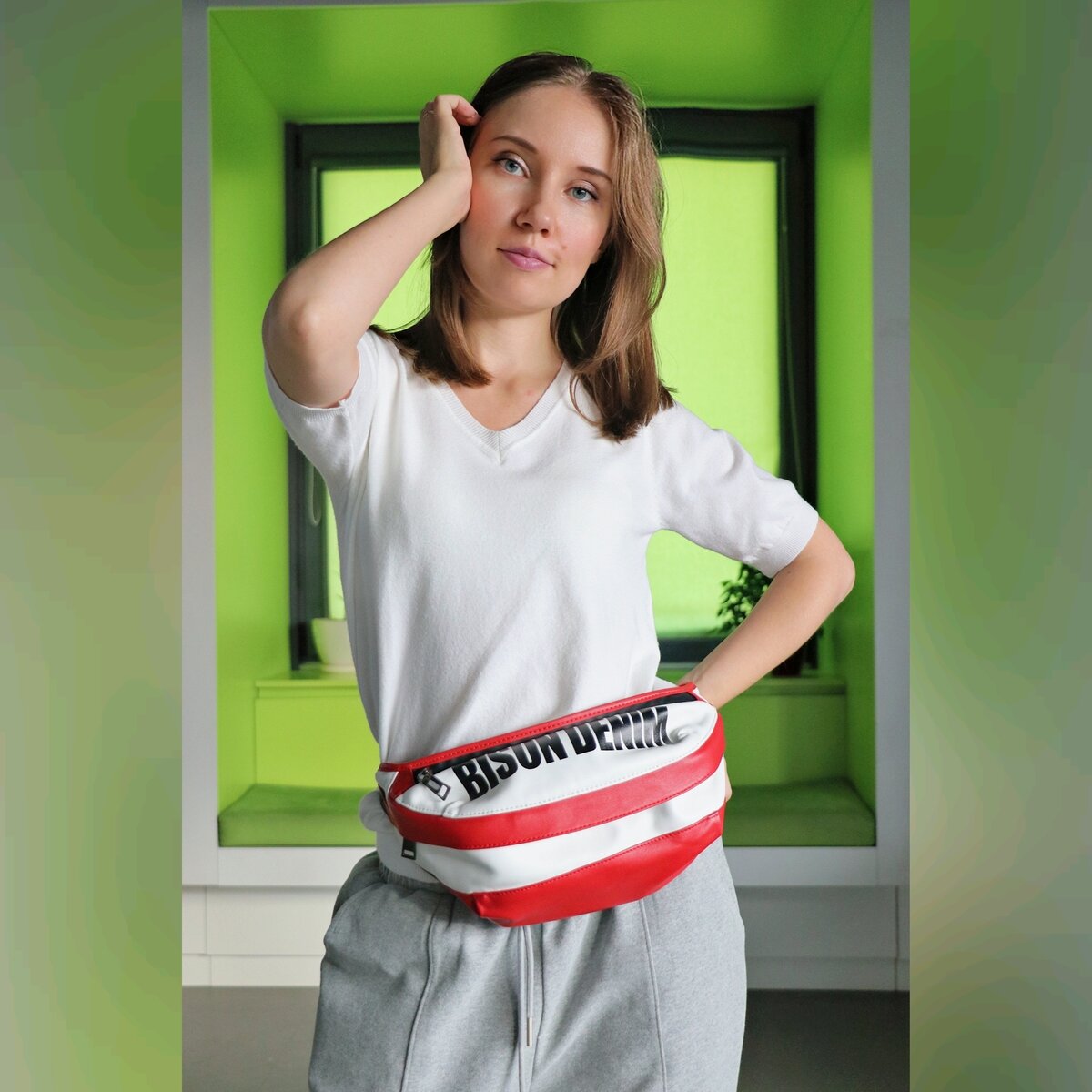 Сумка по форме напоминает банан. Она имеет два внешних отделения на молниях: один отдел небольшой с местами для хранения кредитных карт и кармашком на молнии для мелочей; второй - основной без внутренних карманов, имеем очень много свободного места. В месте прилегания сумки к торсу находится мягкая сетчатая вставка, сумка не натирает.