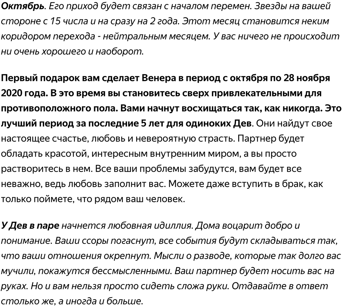 Дев ждет хорошая встряска в период с 15 октября по декабрь 2020 года. Дело в том, что ваш знак встает в оппозицию к враждебным планетам, и в тоже время попадает под управление планеты Любви Венеры. В это время возможно все, что качается любови и отношений, а также начинаний и удачи. Я приготовил для вас одновременно краткий и емкий разбор по месяцам, чтобы вы могли точно знать что произойдет и
