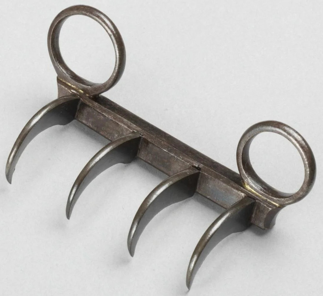 Это оружие представляет собой два полумесяца, которые скрещены между собой. Это парное оружие, берущее свои корни из Китая. Его использовал создатель учения кунг-фу Дун Чуанем. Он был сборщиком налогов, ему приходилось много путешествовать. Существуют поверья, что он отбивался от разбойников только благодаря рогам оленя в виде кастета. Он мог в одиночку справиться с целой бандой. Использовать этот нож виртуозно можно, будучи ознакомленным с правилами боя багуачжан. Только спустя долгие годы ученикам разрешалось использовать этот нож в бою, так как он может быть очень травмоопасным для самого себя.