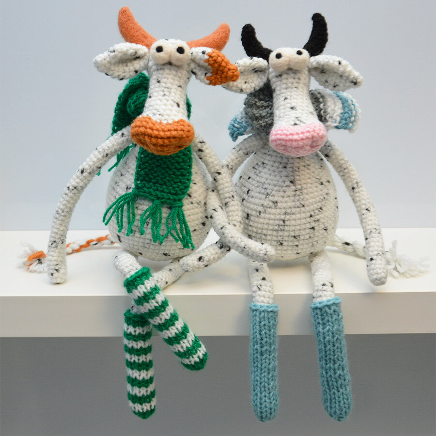 Добрый день. Еще прошлым летом я в своих статьях поднимала такую тему: какие мастер-классы удобнее? Видеоуроки или в формате текстов с фотографиями... Про себя я говорила так: видео, конечно, наглядный вариант, но порой очень неудобный. И если рассматривать вязание, то обычно сложно вязать вместе с мастером и одновременно вникать во все нюансы, плюс скорость вязания у всех разная.... приходится постоянно ставить на паузу. Намного проще видеть схему, описание и фото перед глазами и при этом комфортно работать в своем темпе! А вообще я люблю сама создавать, придумывать игрушки. И самый интересный момент - это оформление мордочек, создание образа, подбор аксессуаров для игрушек! Даже вроде одинаковые игрушки всегда получаются с разным характером!!! Наступающий 2021 год - год белого металлического быка! Но коровы тоже вполне могут зайти на огонек))) и быть в центре внимания. Тем более такие белоснежные и яркие особы! Такие игрушки с проволочным каркасом могут быть декором на шампанское