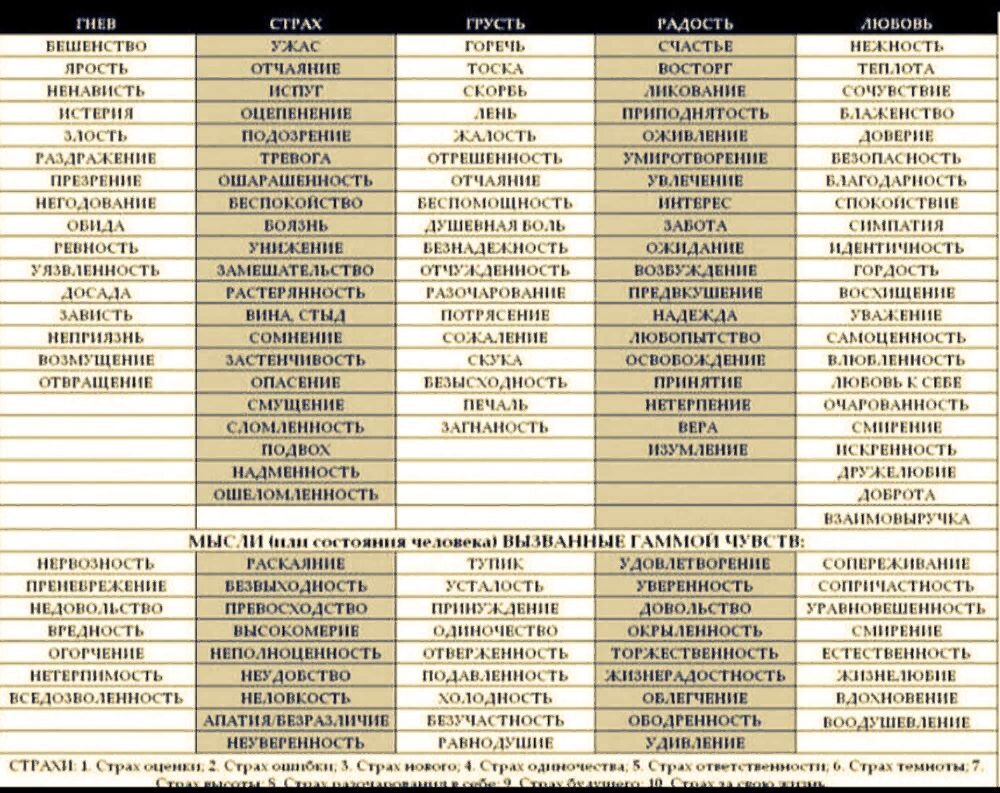 Каждый раз, когда происходит ситуация, что выводит вас из равновесия, мысленно задайте вопрос «Какие эмоции в данный момент я испытываю?», а чтобы легче было определить, прилагаю к данной статье таблицу эмоций и чувств.