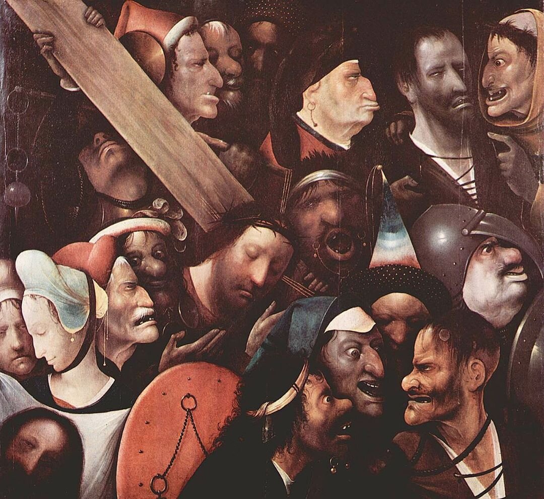 От одного взгляда на полотно может развиться клаустрофобия - слишком уж здесь тесно, душно и шумно. Пространство картины заполняет парад уродливых лиц: кривые носы, выступающие подбородки, гнилые зубы и злой блеск глаз. На жутком фоне выделяется спокойное и кроткое лицо Христа. Прикрыв глаза, Он тихо несёт свой крест.