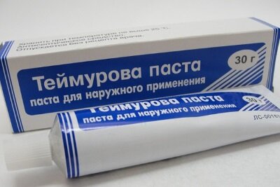 Паста Теймурова имеет в составе антисептические и антибактериальные компоненты, благодаря которым обрабатываемые кожные покровы обеззараживаются, уничтожается патогенная микрофлора, что помогает избавиться от неприятного запаха. Цинк помогает остановить воспалительные процессы и способствует скорейшему заживлению. Подсушивающие и дезинфицирующие составляющие убирают излишнюю влагу. Под воздействием состава пасты кожа очищается от отмерших клеток дермы, восстанавливается микрофлора и происходит регенерация клеток. Показания к применению Согласно инструкции, имеются следующие показания к применению: гипергидроз стоп, подмышек, ладоней; опрелости и потертости; избыточное потоотделение; начальная стадия грибка кожных покровов; неприятный запах ног; микоз стоп. Противопоказания Мазь Теймурова имеет следующие противопоказания к применению: Нельзя наносить пасту на кожу с выраженными воспалительными признаками, открытые раны, порезы, ожоги, ушибы, язвы, прыщи. Противопоказано использование мази женщинами в период беременности и грудного вскармливания. Не рекомендуется использовать мазь детям до 14 лет. С осторожностью следует пользоваться средством людям, склонным к аллергическим реакциям. Нельзя наносить пасту на лицо, волосистую часть головы. Следует избегать попадания на слизистые участки носа, глаз, губ, рта и половых органов. Нельзя применять средство в течение длительного периода и на больших участках кожи, во избежание интоксикации путем накапливания опасных составляющих препарата (цинка, свинца). С особой осторожностью следует использовать мазь людям с почечной недостаточностью и другими заболеваниями почек. Преимущества и недостатки пасты Паста является универсальным средством, но в основном применяется против избыточной потливости отдельных участков тела, борется с неприятным запахом и незначительными воспалениями. Мазь можно применять для профилактики грибковых заболеваний кожи и ногтей и для лечения микозов на начальных стадиях заболевания. ПРЕИМУЩЕСТВОМ ЯВЛЯЕТСЯ ДОСТУПНОСТЬ И НЕВЫСОКАЯ СТОИМОСТЬ МАЗИ ТЕЙМУРОВА. К недостаткам можно отнести присутствие в составе токсичных веществ – цинка и свинца, которые имеют способность проникать через кожные покровы и накапливаться в организме. Также паста имеет жирную консистенцию, что не позволяет ей быстро впитываться, для этого требуется некоторое время. Мазь обладает специфическим запахом, поэтому рекомендуется наносить ее на ночь, а не перед выходом на улицу. Побочные действия Мазь Теймурова редко вызывает побочные эффекты, если следовать инструкции по применению. Однако в отдельных случаях при нанесении на кожу может появиться жжение и зуд, которые проходят по истечении короткого времени. Если неприятные симптомы не исчезают, то следует тщательно смыть пасту водой. При чувствительной коже могут наблюдаться аллергические реакции в виде кожной сыпи и раздражения. В этом случае следует прекратить использование препарата. Способ применения и дозировка Перед нанесением мази необходимо вымыть обрабатываемые участки кожи и вытереть их насухо полотенцем. Препарат наносится на места повышенной потливости путем втирания. Наносить следует тщательно, чтобы обработать полностью проблемную зону. Затем обрабатываемый участок оставляют в покое 