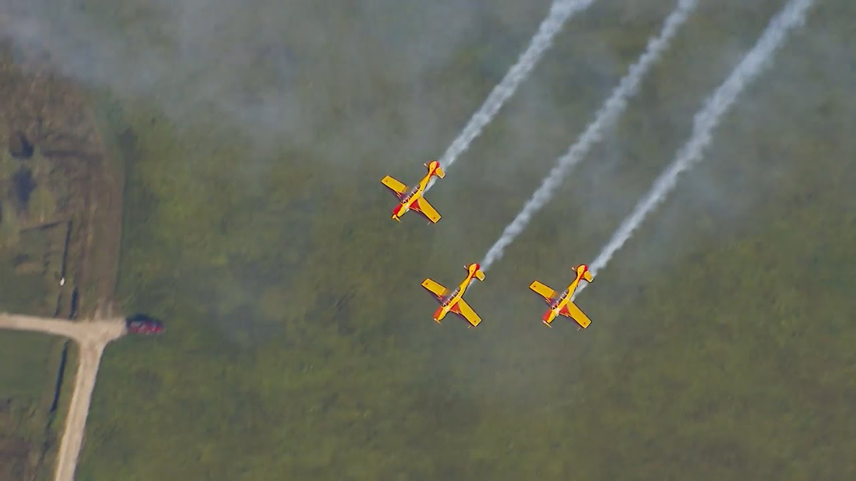 Для того чтобы в небе можно было разглядеть самолеты и каждую выполненную петлю, пилоты всю неделю ждали такую ясную погоду. И вот, наконец, тройка Як-52 выходит на старт — высоту 900 метров. Словно в центрифуге — небо — земля — снова небо, и так одиннадцать раз подряд.