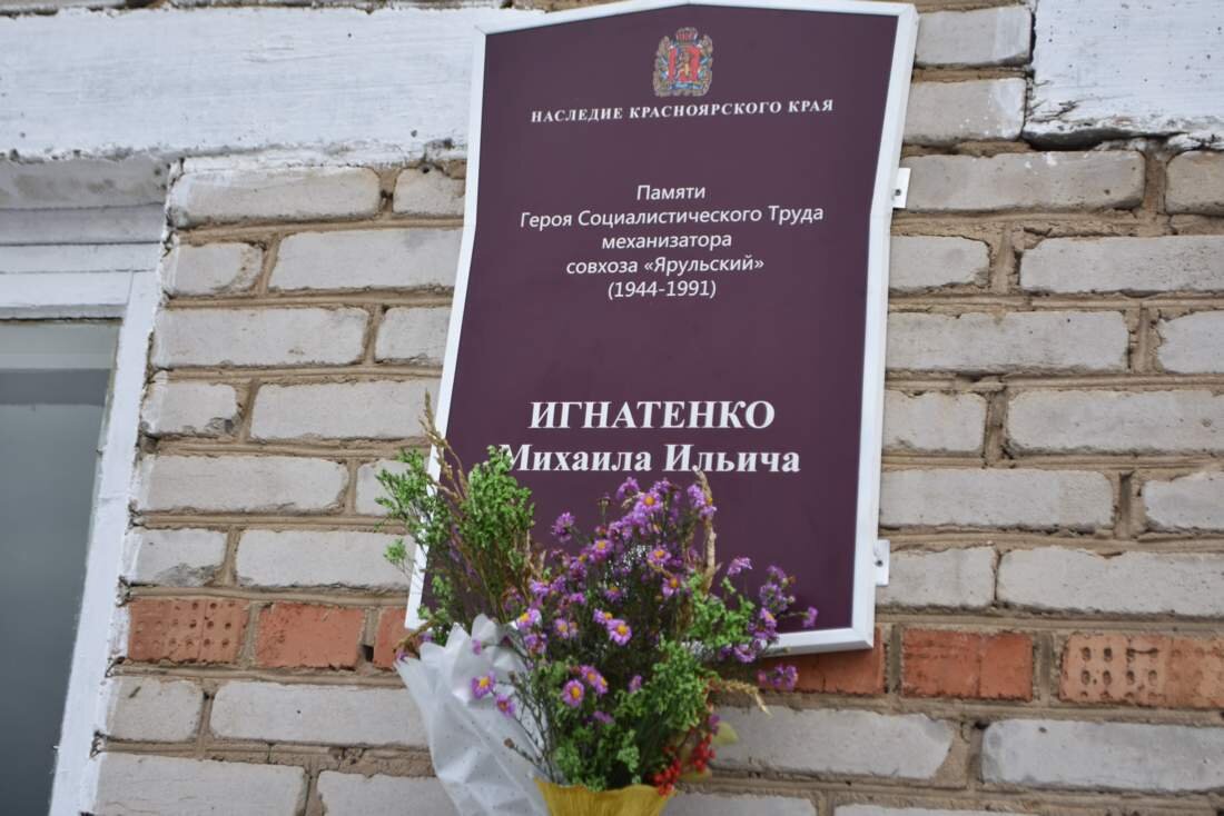 В ирбейском селе Усть-Яруль в минувшую пятницу была торжественно открыта мемориальная доска Герою Социалистического труда, знатному хлеборобу Михаилу Ильичу Игнатенко.