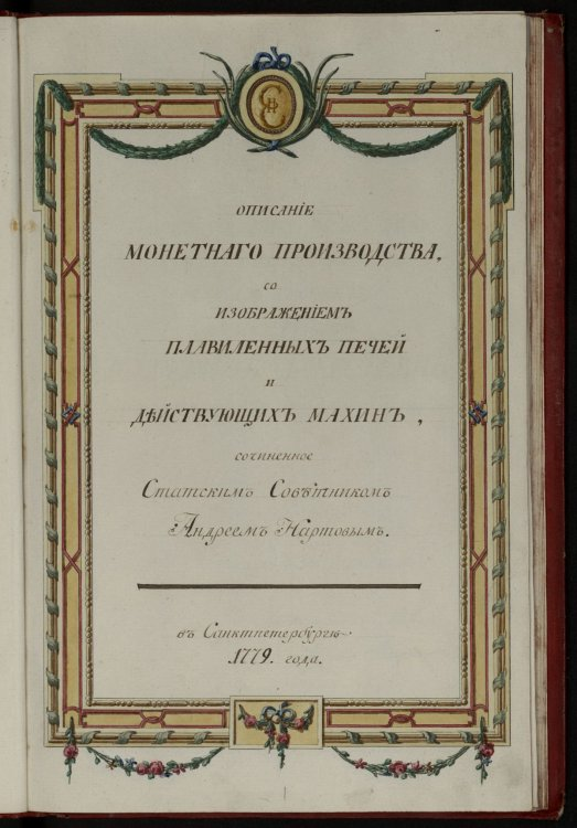 Описание монетного производства со изображением плавиленных печей и действующих махин, сочиненное статским советником Андреем Нартовым. § 1. Щедрая натура, обогатившая золотосодержащими серебряными рудами окрестныя горы Колывановоскресенские, отверзла земное недро для почерпания из оного драгоценных металлов. Великаго удивления заслуживают они сцеплением составных своих частей и каменистых горных пород в минералогии. Раздробление и изследование их относится к рудословному описанию, но здесь главным предметом предлежит добыча выплавляющагося на тамошних заводах золотистаго серебра, которого в Санктпетербург каждый год более тысящи пуд привозится. А как сии заводы принадлежат собственно ея императорскому величеству и препоручены Кабинету, то и присылается оно прямо во оный, откуда отдается в Кантору разделения золота от серебра. Не менее сего примечания и уважения достойны заводы Нерчинския, на коих вообще с рудопромышленничьим добывается из свинца до 600 пуд золотистаго серебра, сообщ