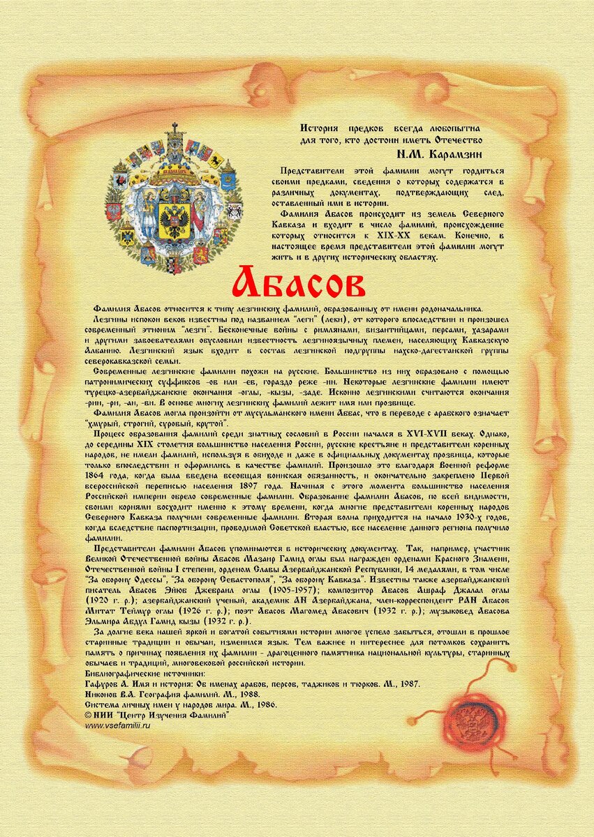 Фамилия Абасов могла произойти от мусульманского имени Аббас, что в переводе с арабского означает «хмурый, строгий, суровый, крутой».