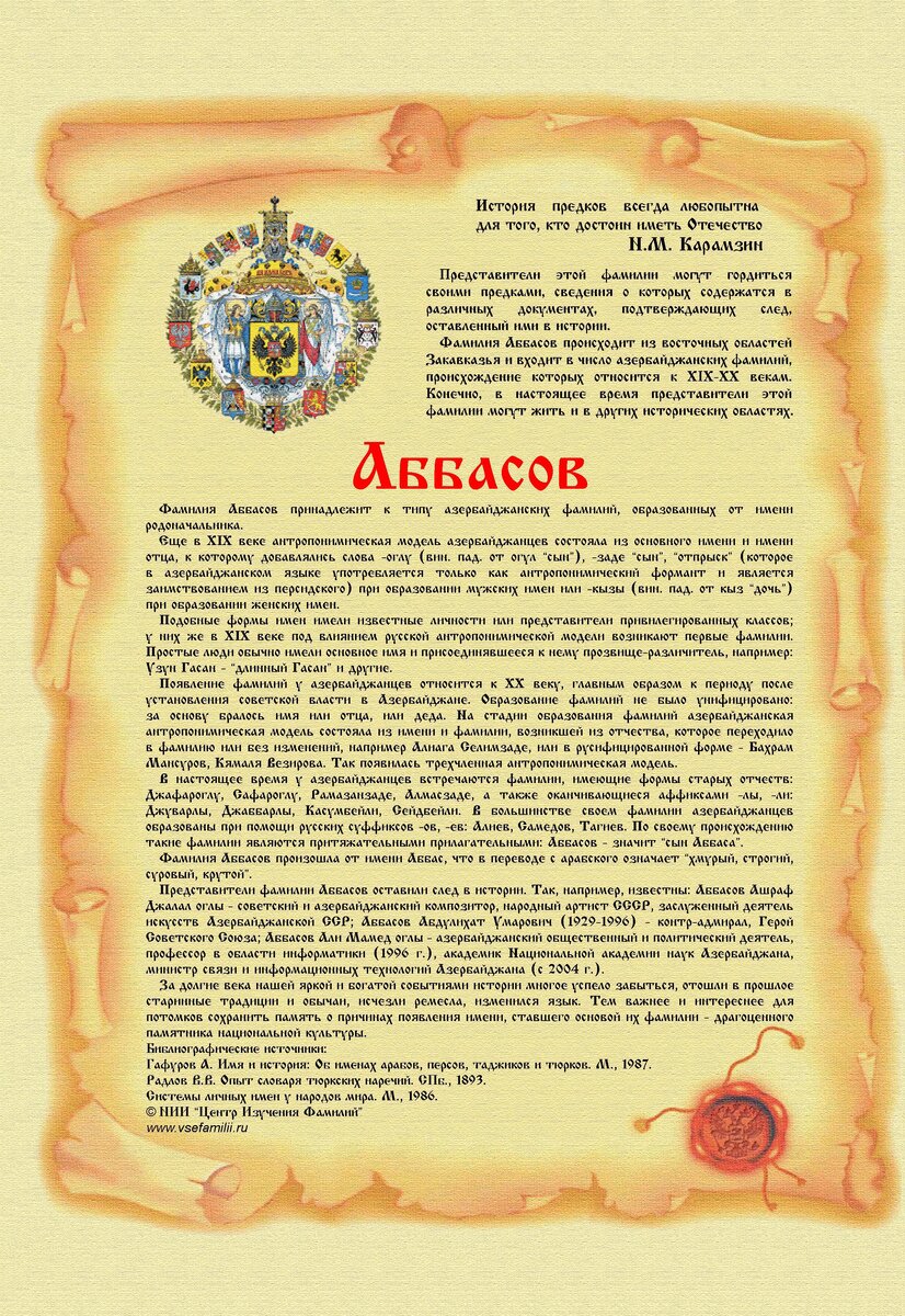 Фамилия Аббасов произошла от имени Аббас, что в переводе с арабского означает "хмурый, строгий, суровый, крутой".